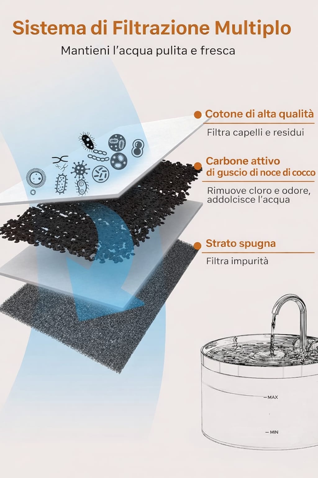 Sistema di filtraggio quadruplo: La fontana per gatti è dotata di un filtro aggiornato che filtra efficacemente peli, polvere e altri detriti, elimina gli odori e addolcisce l'acqua per fornire al vostro animale domestico acqua fresca e pura.